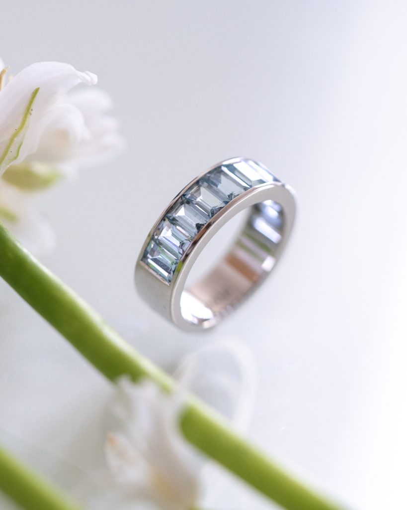 Un anneau comme un chemin, serti de petites pierres couleur d’horizon – celles qui rappellent la mer, le ciel, et tous les ailleurs qu’ils rêvent de parcourir ensemble.