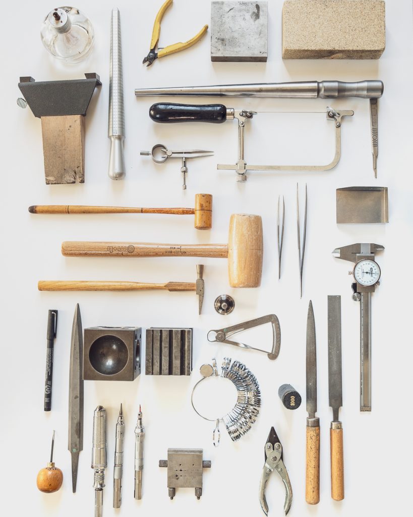 Le maillet frappe l’anneau sur le triboulet pour lui redonner sa forme ronde, le marteau marque le métal pour écrouir, on emboutie des formes pour créer du volume et exprimer nos visions à travers le métal, on coupe, on maintient le métal grâce aux pinces, pour mieux lui donner les détails souhaités.